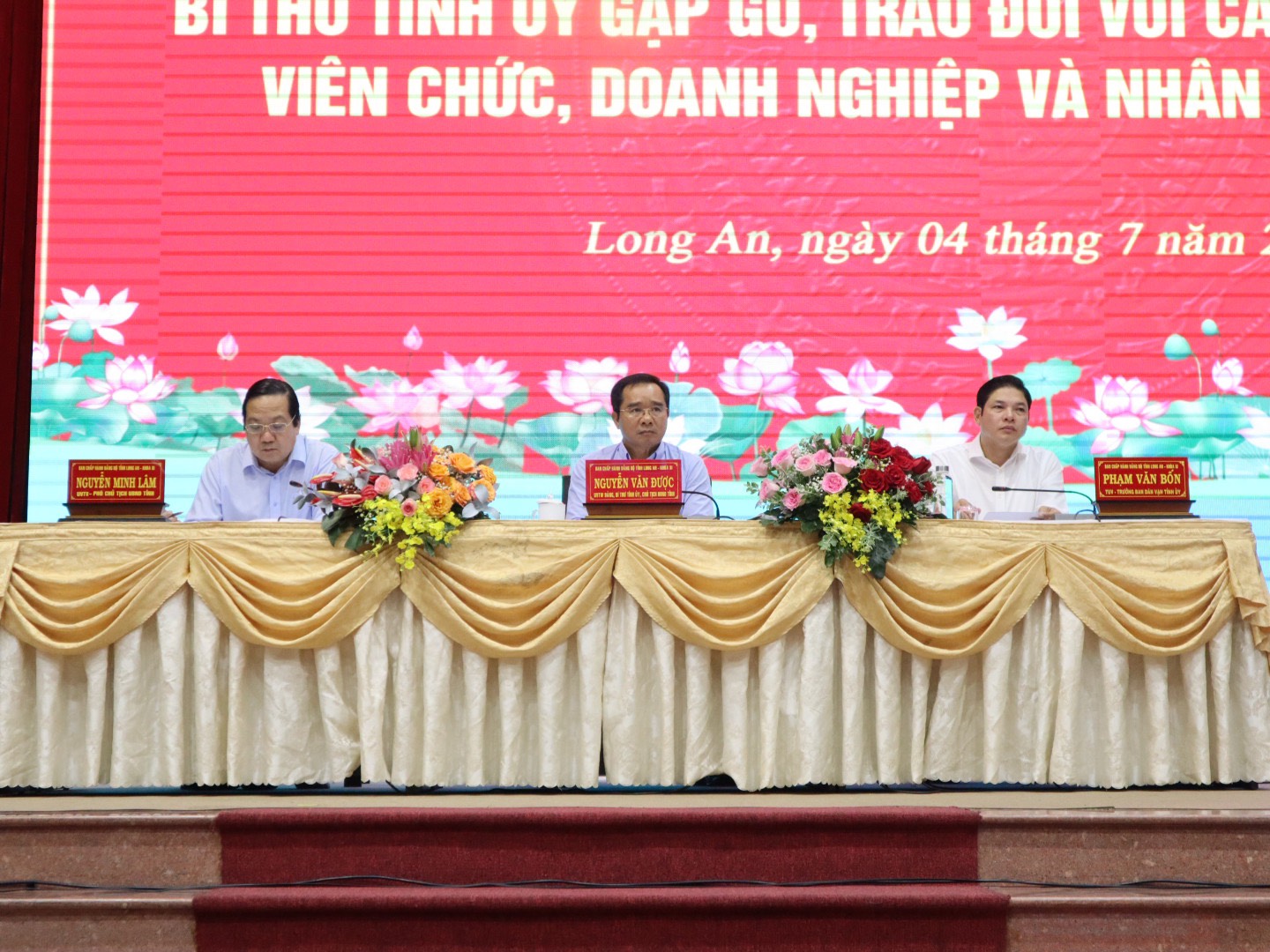 Sáng 7/4, Bí thư Tỉnh ủy – Nguyễn Văn Được gặp gỡ, trao đổi với cán bộ, công chức, viên chức, doanh nghiệp và nhân dân năm 2024. Tham dự hội nghị có Phó Vụ trưởng, cơ quan Thường trực Ban Dân vận Trung ương tại TP.HCM - Phạm Minh Tâm; Phó Chủ tịch UBND tỉnh – Nguyễn Minh Lâm.