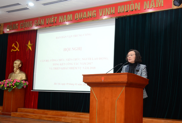 Tại Hội nghị, đồng chí Trần Thị Bích Thủy, Phó Trưởng Ban đã trình bày dự thảo Báo cáo kết quả thực hiện Nghị quyết Hội nghị cán bộ, công chức và công tác cơ quan năm 2017, nhiệm vụ công tác năm 2018 trong đó khẳng định: Năm 2017, Ban Dân vận Trung ương có sự chuyển biến cơ bản về việc đổi mới, nâng cao chất lượng tham mưu, tăng cường công tác kiểm tra, khảo sát, hướng dẫn, phấn đấu hoàn thành và hoàn thành vượt mức kế hoạch công tác đã đề ra. Cán bộ, công chức, viên chức, người lao động tiếp tục phát huy tinh thần trách nhiệm, nỗ lực hoàn thành nhiệm vụ, xây dựng cơ quan đoàn kết, dân chủ và đổi mới.