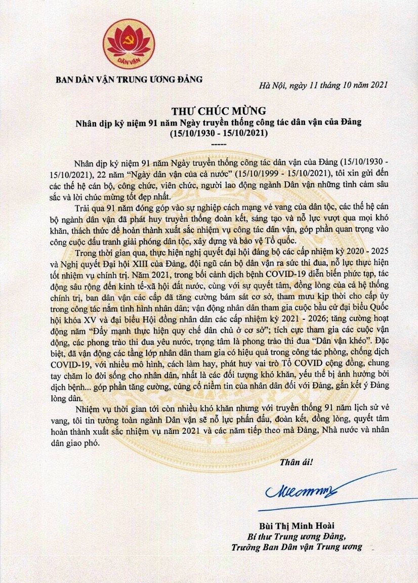 Thư chúc mừng của Trưởng Ban Dân vận Trung ương nhân dịp kỷ niệm 91 năm Ngày truyền thống công tác dân vận của Đảng (15/10/1930 - 15/10/2021)