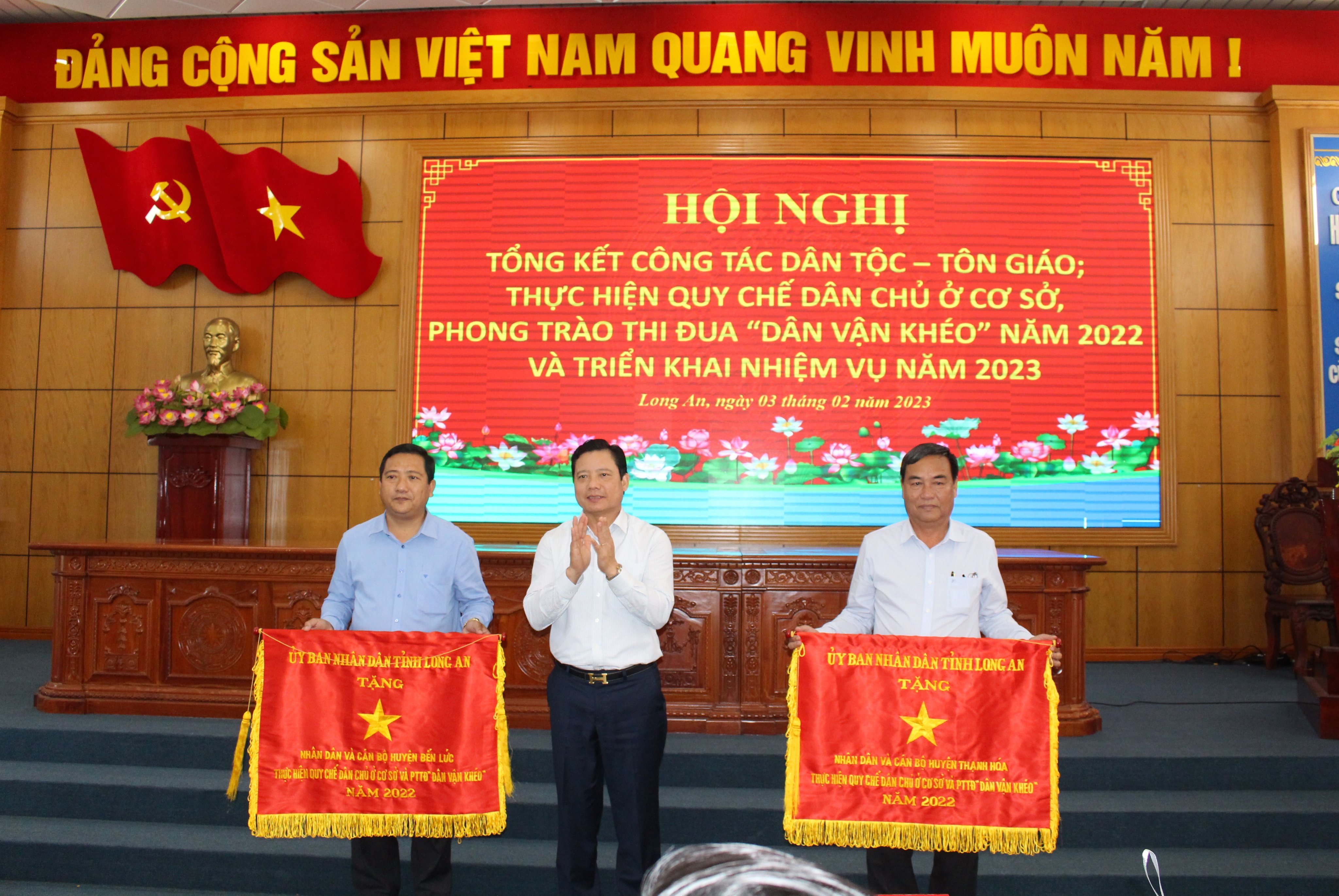 | Phó Chủ tịch UBND tỉnh - Phạm Tấn Hòa trao cờ và bằng khen của UBND tỉnh cho các tập thể tiêu biểu trong thực hiện QCDC ở cơ sở và phong trào thi đua "Dân vận khéo" năm 2022 |