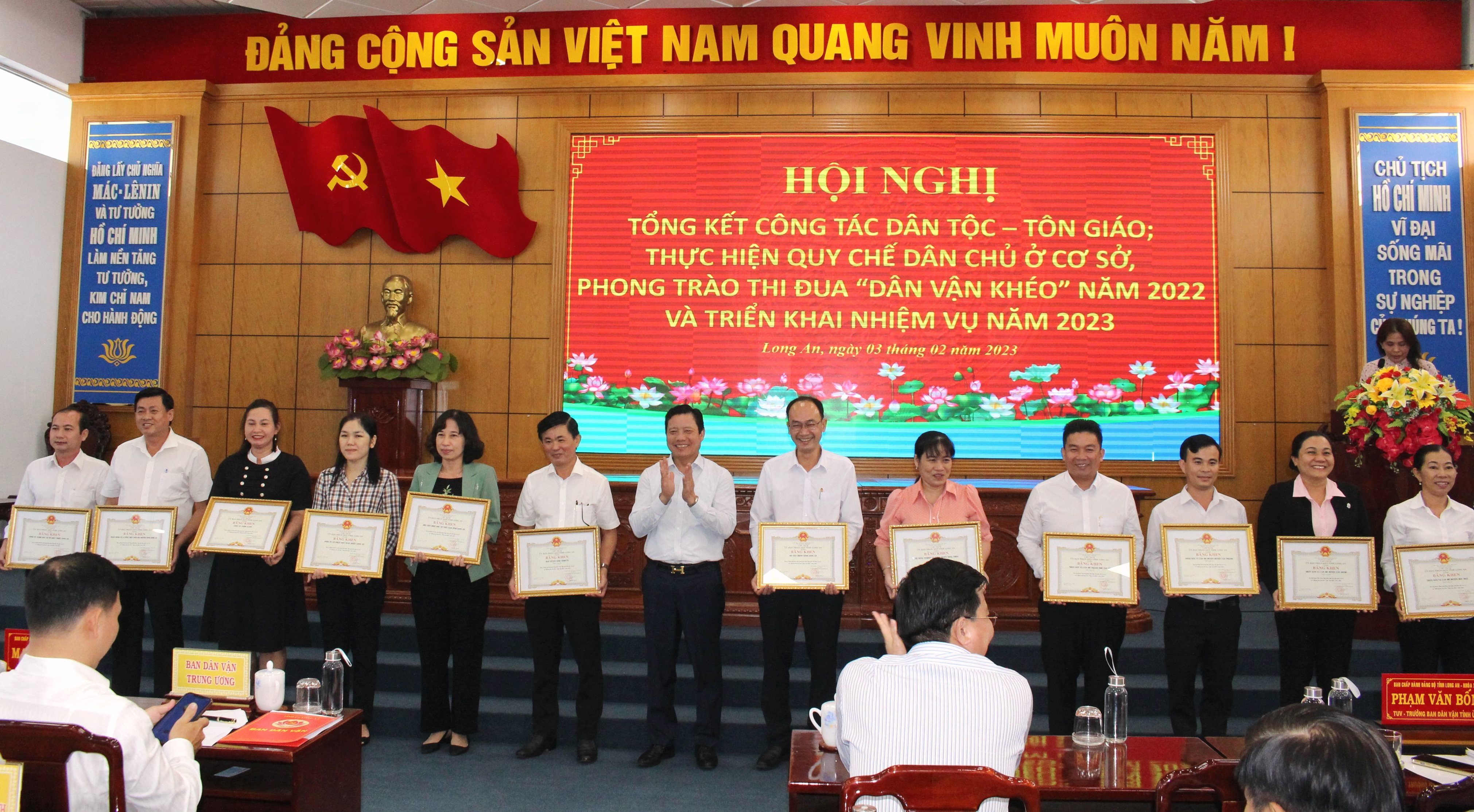 Nhân dịp này có 02 tập thể được nhận cờ, 12 tập thể nhận bằng khen của UBND tỉnh vì có thành tích tiêu biểu trong thực hiện QCDC ở cơ sở và phong trào thi đua “Dân vận khéo” năm 2022.