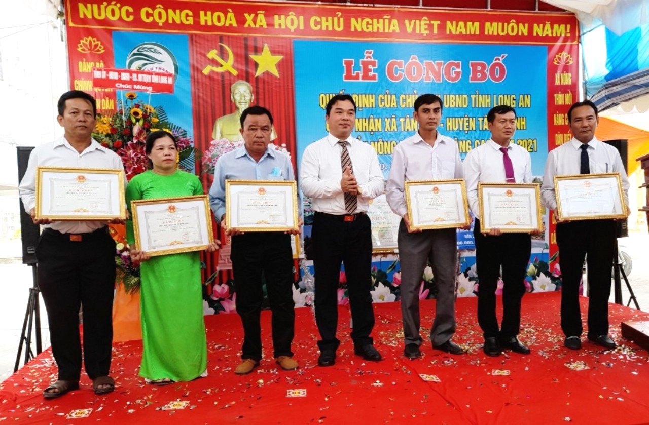 Ông Đặng Văn Nhanh (thứ nhất bên trái) nhận Bằng khen của Chủ tịch UBND tỉnh trong buổi lễ công nhận xã Tân Lập đạt chuẩn Nông thôn mới |