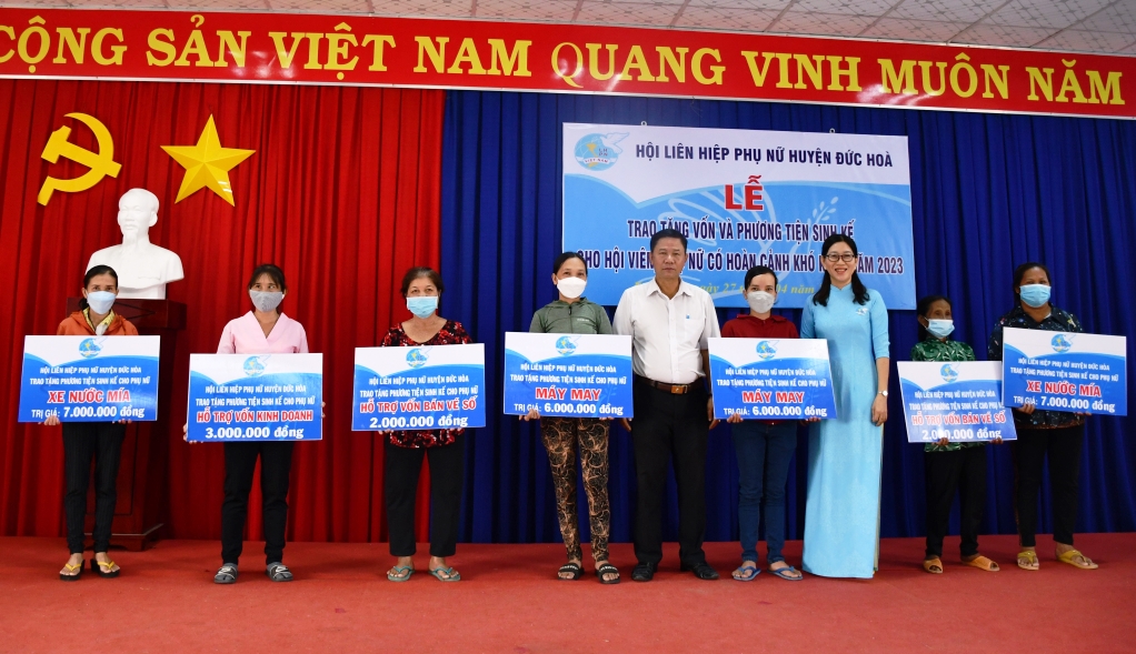Trong chương trình, Hội Phụ nữ huyện cũng tổ chức tập huấn nâng cao năng lực cho phụ nữ doanh nghiệp, quản lý hợp tác xã và chủ hộ kinh doanh. Đồng thời, trao vốn và trao phương tiện sinh kế hỗ trợ hội viên, phụ nữ khởi sự kinh doanh. Theo đó, Hội đã trao 6 máy may, 6 xe nước mía, hỗ trợ vốn bán vé số cho 6 chị, hỗ trợ vốn mua bán trái cây cho 1 chị và vốn mua xe đẩy cùng hàng hóa buôn bán cho 1 chị. Tổng kinh phí thực hiện 96 triệu đồng.